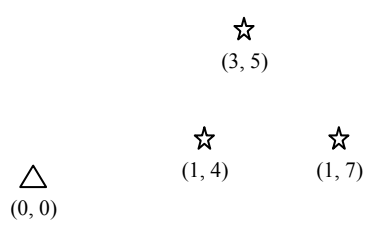 Εξήγηση: Υπάρχουν συνολικά τρεις τράπεζες στα σημεία \((1, 4)\), \((1, 7)\) και \((3, 5)\). Θα χρειαστούμε αναγκαστικά \(2\) ρομπότ. Το πρώτο θα ξεκινήσει από την αρχή \((0, 0)\) και θα ληστέψει τις τράπεζες στα σημεία \((1, 4)\) και \((3, 5)\). Το δεύτερο θα ξεκινήσει επίσης από την αρχή και θα ληστέψει την τράπεζα στο σημείο \((1, 7)\). Εξίσου καλά θα μπορούσε να ληστέψει το πρώτο την τράπεζα στο σημείο \((3, 5)\) και το δεύτερο τις τράπεζες στα σημεία \((1, 4)\) και \((1, 7)\). Ένα μόνο ρομπότ, κινούμενο μόνο δεξιά και πάνω, δεν μπορεί να περάσει και από τις τρεις τράπεζες για να τις ληστέψει.